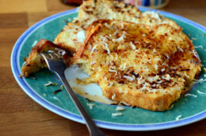 - Tremper chaque tranche de brioche dans ce mélange, puis passez-les dans de la noix de coco râpée.